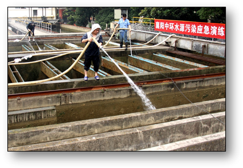 5月28日上午,襄陽(yáng)中環(huán)水務(wù)米公水廠開展了一場(chǎng)“水源污染應(yīng)急演練”?!把菥殹蓖ㄟ^(guò)該廠位“漢江取水口水源地突遭不明原因污染”,城市供水“被迫緊急停止” …… 。圖為演練過(guò)程中,米公水廠員工利用多支高壓水槍,對(duì)水廠“被污染水池池面、管道” 等進(jìn)行全面、徹底的清洗?!把菥殹?/SPAN> 進(jìn)一步提高了企業(yè)員工處置突發(fā)事件的思想意識(shí)和能力。